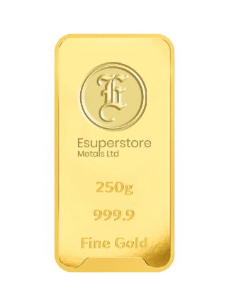 Esuperstore Metal Ltd. 250g gold minted bar is produced at our internationally recognised London refinery. This bar is produced to the internationally recognised 999.9 standard and carries Esuperstore Metal Ltd. mark, the weight, fineness and a unique serial number. Bars are supplied in sealed, tamper resistant packaging.